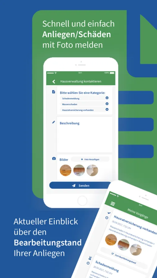 Als Mieter oder Eigentümer können Sie Schäden oder Anliegen direkt mit Fotos über unsere App melden. Ihre Anfragen stehen unseren Mitarbeiten dann zur Verfügung und können auch an Handwerksbetriebe weitergeleitet werden.