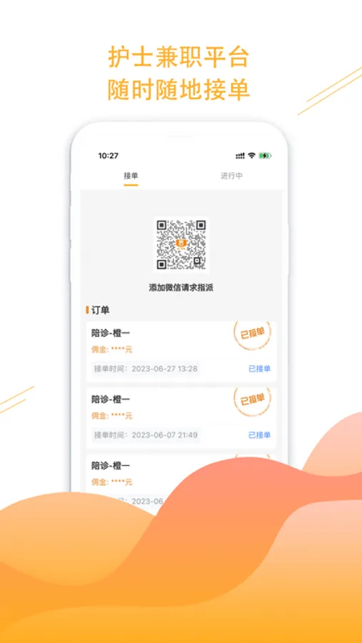 橙一护士,护士兼职平台——随时随地接单服务。在橙一护士平台里,有居家护理、患者管理、医生助理、保险资料收集、临床试验患者招募、建立自己的团队等,发挥护士群体的光和热,涨收入,增地位,找到成就感。