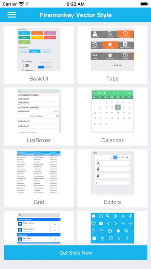 This application provides Firemonkey Vector UI Deisgn without using any third party components. All UI elements are put into a single style file. It can be used easily with not only new Apps, but existing Apps without code. Any modifications can be done using Firemonkey Style Designer inside the IDE, without using bitmap tools like Photoshop.