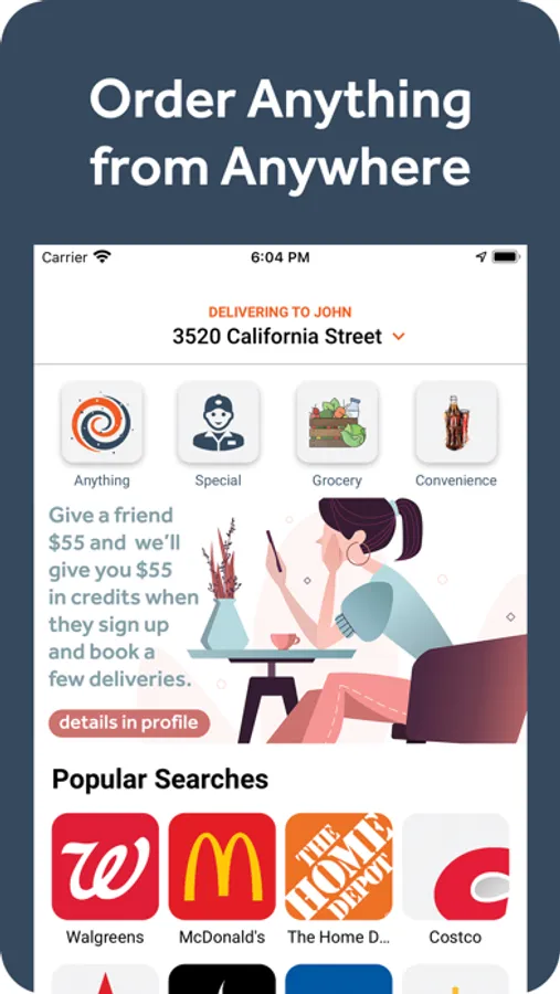 Also, from the app, you can use your personal referral code to invite friends and receive $55 in credits when they sign up and complete a few deliveries.
