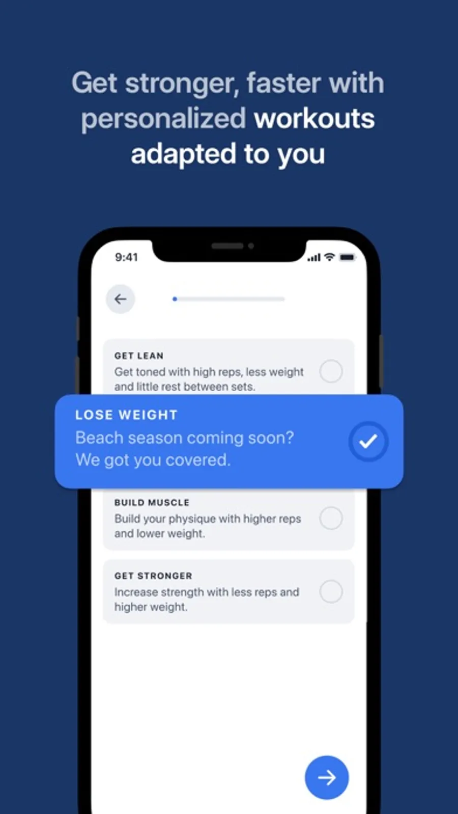 Every body is different, and no one-size-fits-all. Shape first understands your weight training ability and fitness goals through an interactive quiz. Once we've gotten to know you, Shape generates a custom-fit progressive workout grouped around your personal fitness goals.