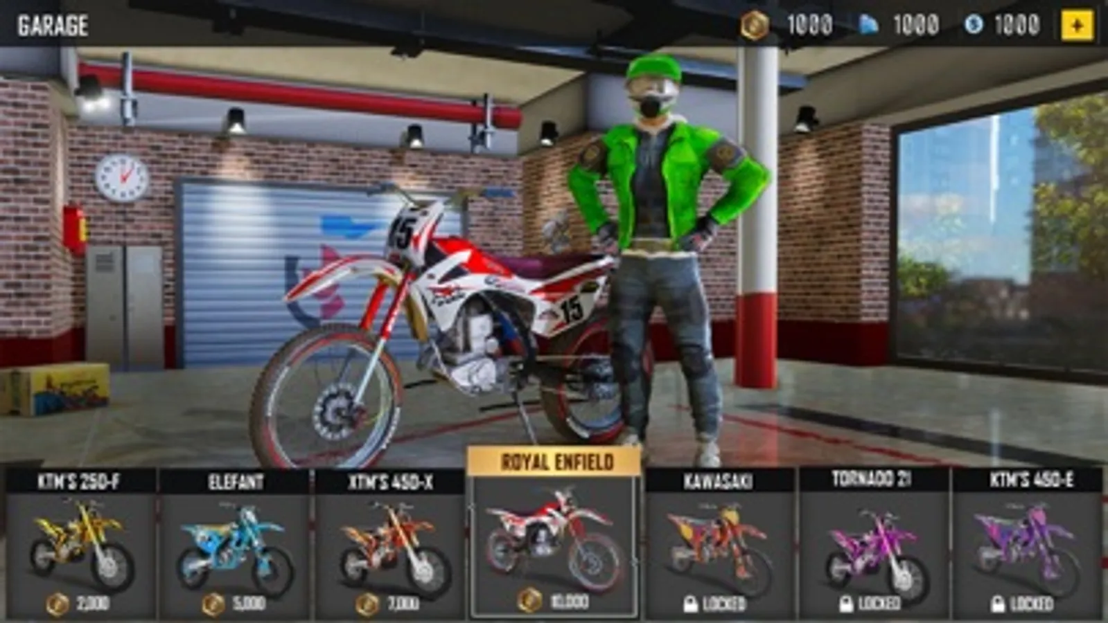 A game garage full of stunt bikes is waiting for you. You can unlock your favorite motorcycle when you need it on race track. After playing some bike race missions your motorcycle must need to tune-up. Upgrade your moto - increased speed, handling & upgrade any bike part to make your riding monster. Customize the outfit of your rider, bring your style in this bike race game. Helmet, gloves & costume of the rider is also available in motorcycle game garage.