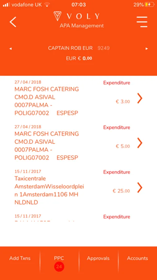 Record charter expenditure on the go. Using the Voly app, crew can view cash and card balances and record APA transactions on the go, in real-time. By using our simple cost centre function you can assign costs by charter, this allows for clear segregation of expenses on back to back charters, eliminating any issues with cross over.