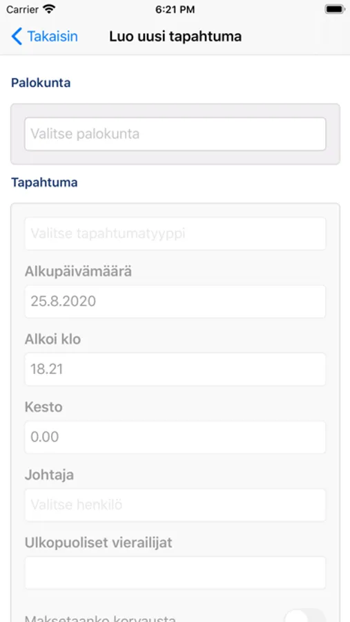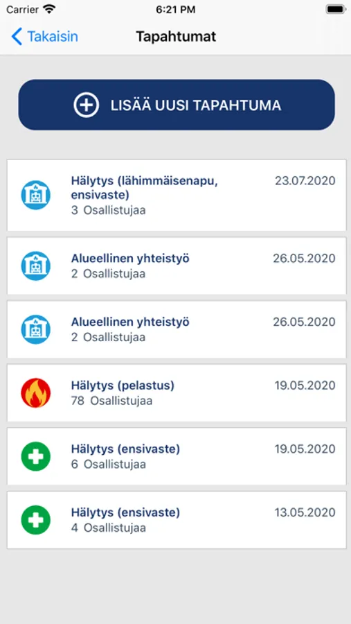 - tapahtuman syöttö: Kirjaa harjoitukset ja hälytykset