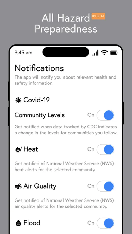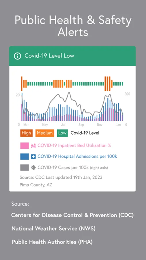 Receive important public health and safety notifications from trusted sources. Covid-19 community level alerts from CDC, weather safety alerts from National Weather Service and other alerts from your local public health departments. Prepare and respond with personalized recommendations that help keep everyone safe.