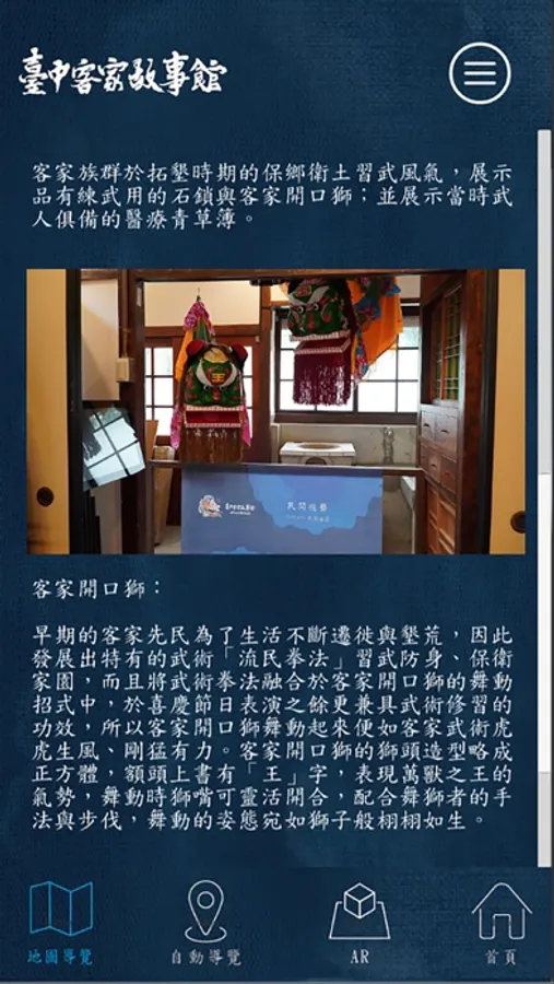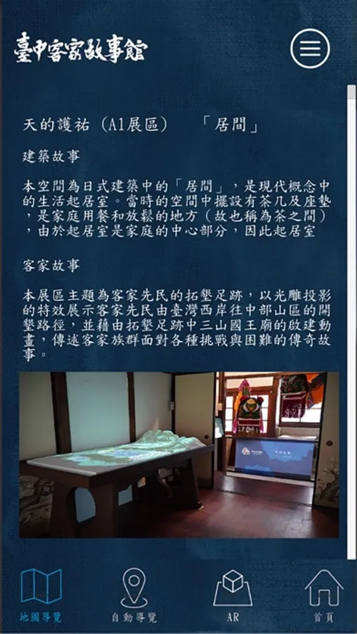 臺中客家故事館將此日式雙併建築,規劃為客家天地人的傳說故事展覽區域。藉由數位展示帶領參訪者透過客家傳統信仰、先民開墾足跡、族群融合等故事深入客家文化的精神領域;並配合數位遊戲的引導,讓大埔客語的學習與山城人文的認識充滿童趣與新意。