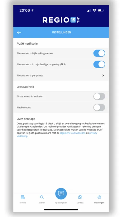 Uiteraard vinden wij toegankelijkheid van de Regio15 app belangrijk. Daarvoor kun je eenvoudig in het ‘Instellingen’ menu de lettergrootte aanpassen en kiezen voor een donkere modus.