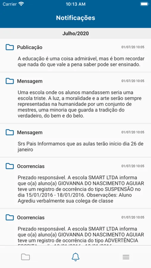 Avisos, ocorrências escolares, declaração de pagamentos, enfim....