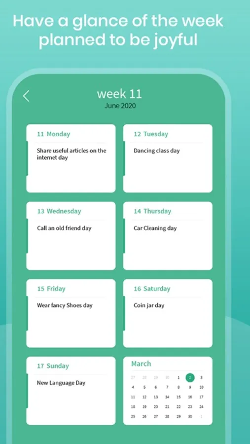 The daily planned joys are the reason this app stands out among many calendars. Every day you get to wake up to a different, fun activity that lets you start off your day with positivity and happiness. You can customize them too: you get a say in when to receive them!