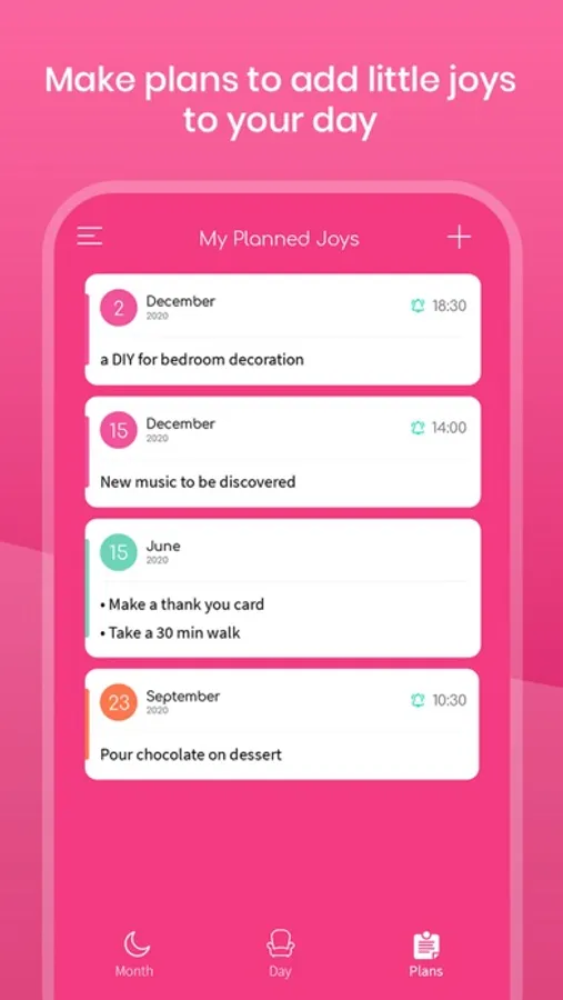 + The chance to create your own joyful plans and set up reminders for them so you’ll never forget them! Simply write them down and set the date and time.
