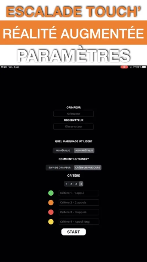 L’observateur, dès que le grimpeur utilise une prise de main ou de pied prévue, il appuie sur le bouton « TOUCH’ ». Si le grimpeur utilise une prise non prévue, l’observateur doit informer immédiatement le grimpeur pour que celui-ci se réorganise afin de respecter l’itinéraire initialement prévu.