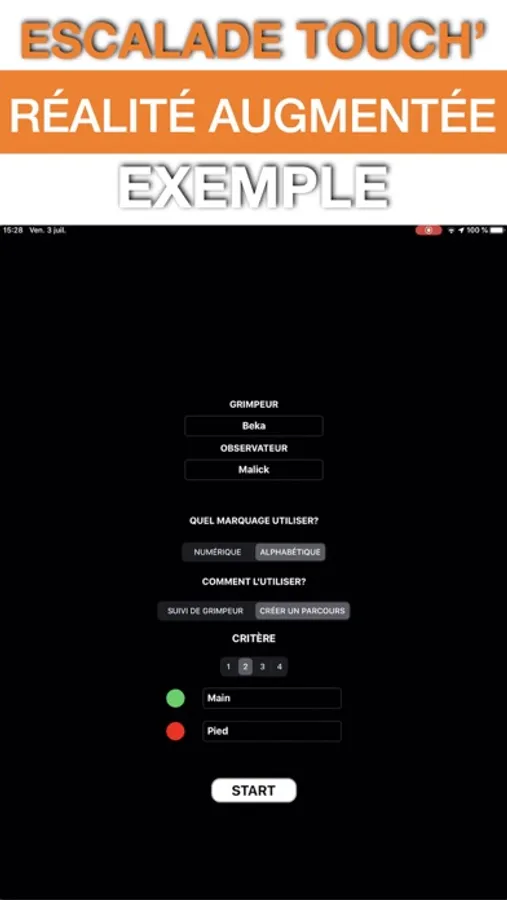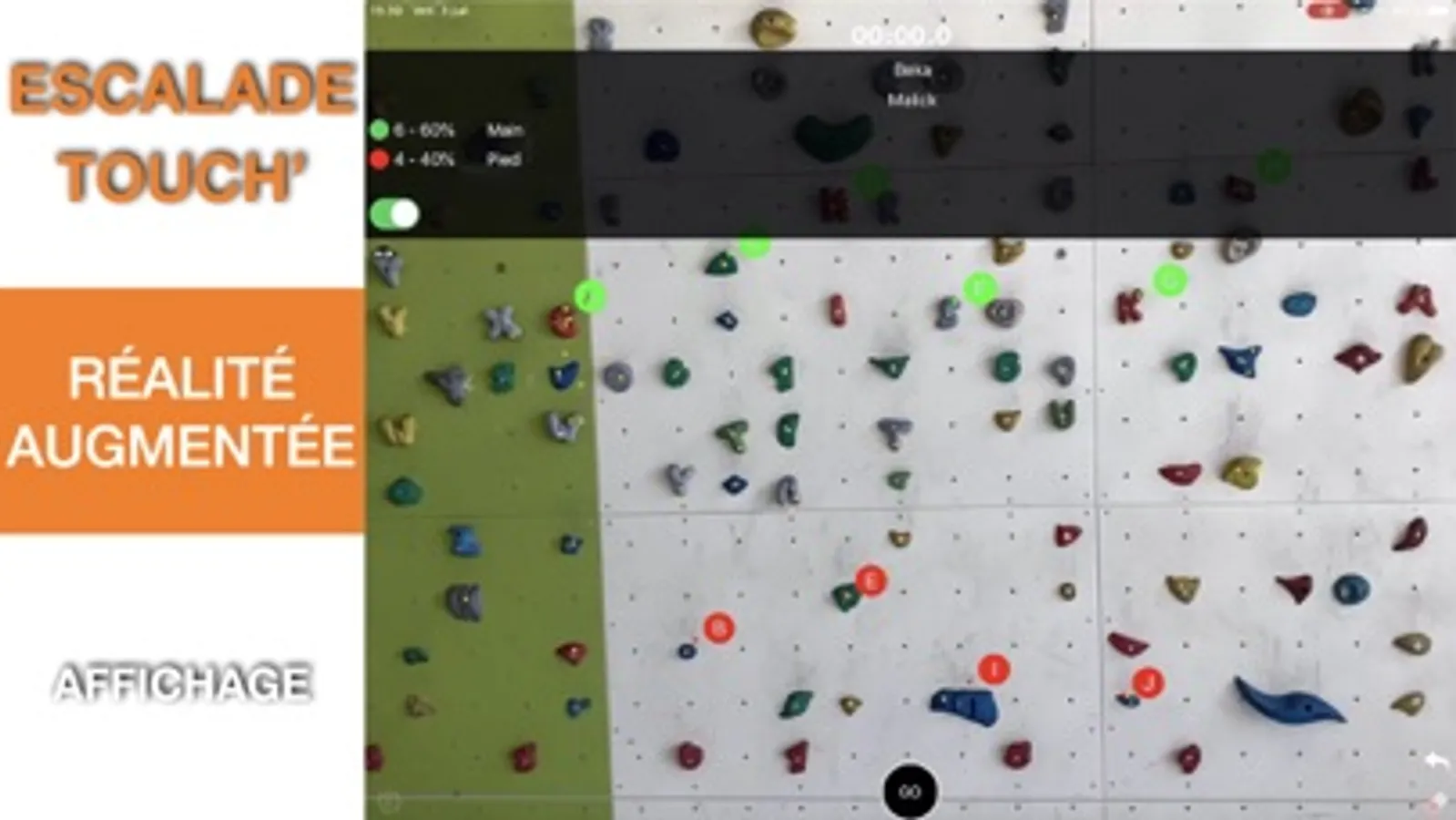 Consignes : Le grimpeur doit identifier ses prises de mains « Touch’ » une fois (Vert) et ses prises de pieds « Touch’ » 2 fois (Rouge).