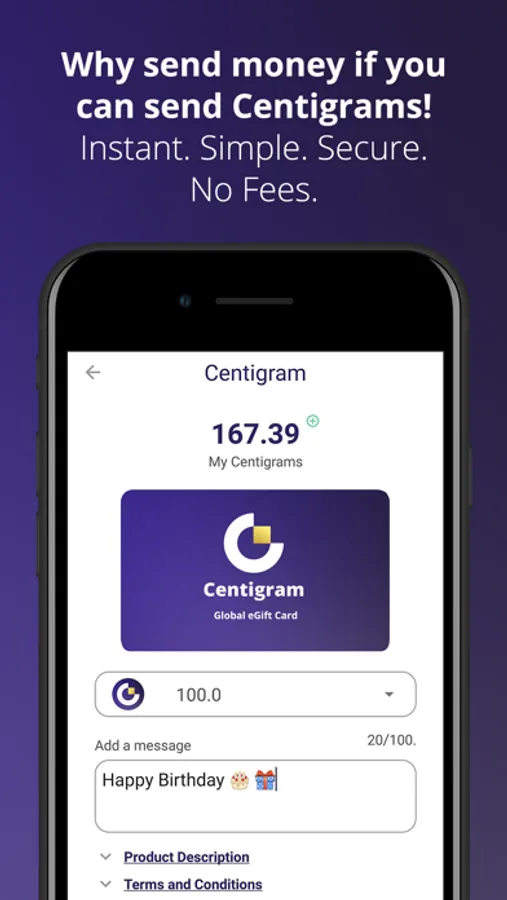 Centigram is a simple app that enables people to delight loved ones, locally or in other countries, instantly, securely, and with NO FEES!