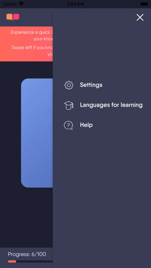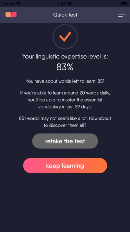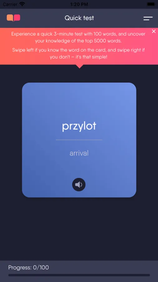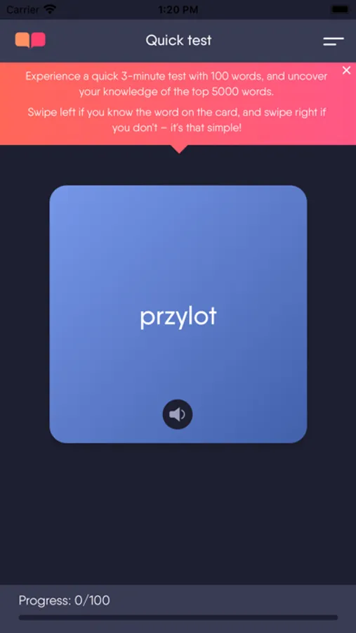 1. Быстрое определение глубины вашего словарного запаса. Потратив 5 минут времени листая карточки со словами программа оценит ваш уровень словарного запаса и предскажет сколько новых слов вы сможете найти пройдя это приложение до конца.