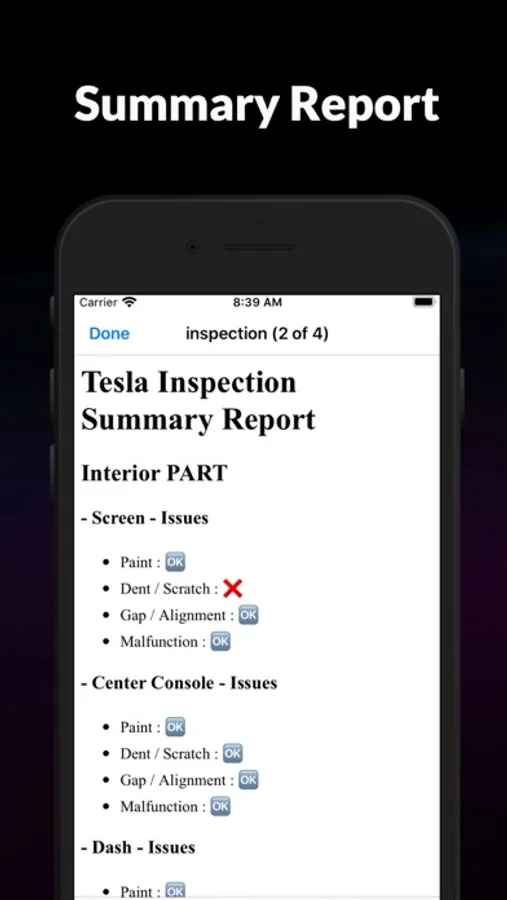 Export to see summary inspect report of your Tesla inspection