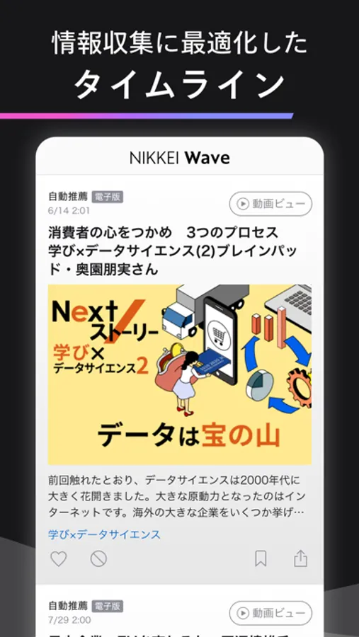 あなたが知りたい情報をタイムラインで網羅。AI が選んだあなたにオススメの記事や、日経の編集者が厳選した記事を表示します。また、RSS を購読することで、日経電子版以外のコンテンツもまとめて表示できます。