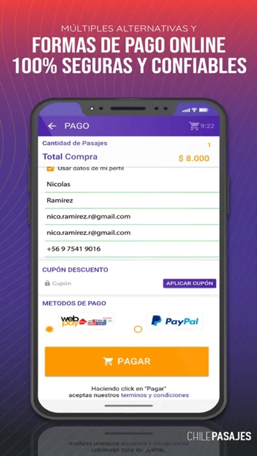 Con simples clics podrás comprar tus pasajes, eligiendo entre las diversas líneas de buses y optando por el precio e itinerario que más te acomode. ¡Y no solo eso! Puedes pagar a través de WebPay o vía PayPal. ¡Tu eliges!