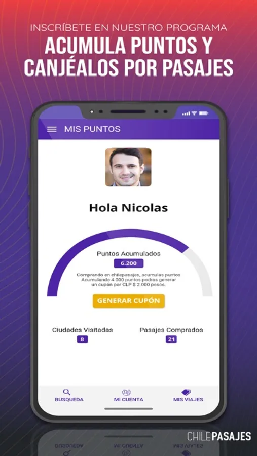 Cada vez que realices una compra a través de tu App ChilePasajes estando registrado, ¡acumularás puntos equivalentes a pesos! Estos los podrás canjear por cupones que te permitirán comprar tus boletos con un importante descuento o inclusive costear la totalidad de tu pasajes. ¡Así no solo viajarás, ganarás y ahorrarás!