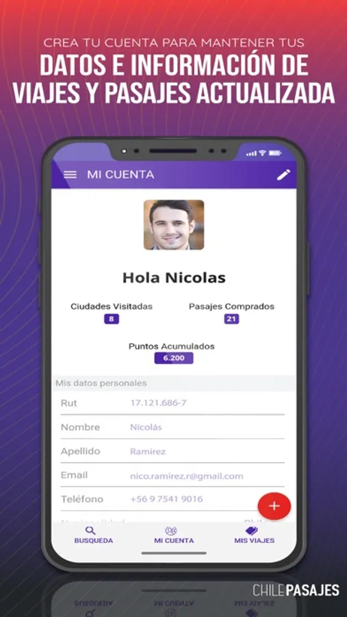 Además de acumular puntos con tu app ChilePasajes, estando registrado guardarás en tu cuenta a tus pasajeros frecuentes, quedando grabados independientemente de dónde inicies sesión.
