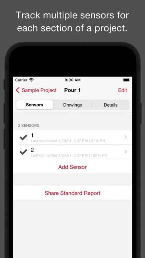 Concrete Sensors is a free construction app that monitors the curing and drying (RH) of concrete in real time that enables better decisions to save time and costs for general contractors, subcontractors, engineers, and others. This app connects to our easy-to-use wireless sensors to display up to the minute concrete curing and drying information.