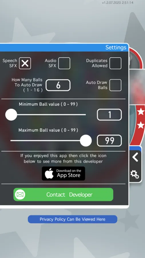 You can also see what balls have currently been drawn and how often they have been drawn since the app has been used. You can also set how many balls get drawn in a single button press from 1-16. All settings will be saved and loaded when you next use the app.