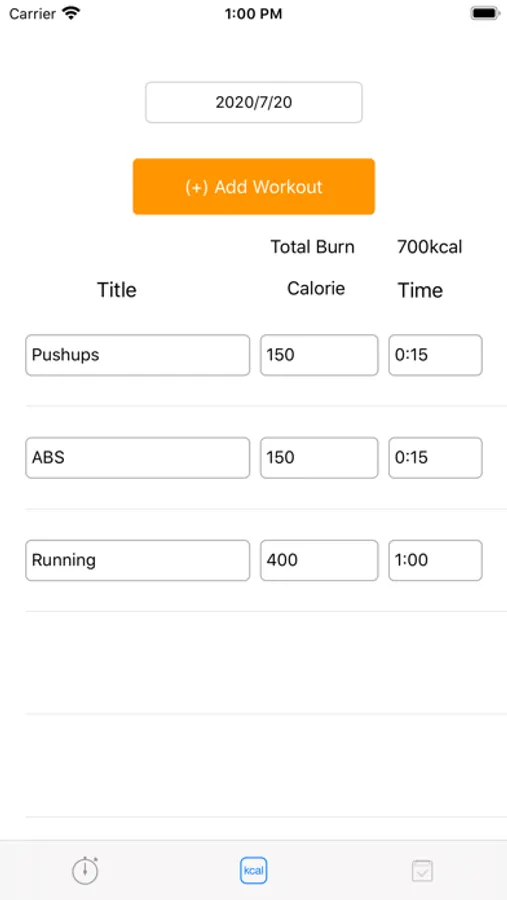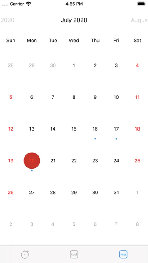 行ったワークアウトのカロリーと時間、ワークアウト名を記録できます。カレンダーを搭載。カレンダーから対象の日付の記録を確認できます。