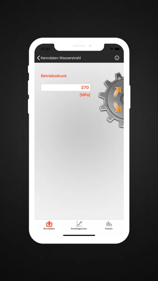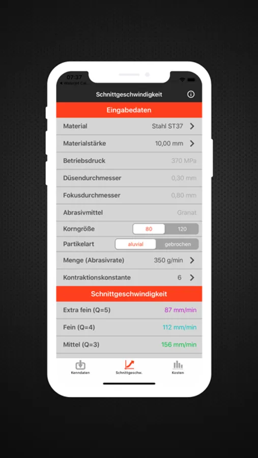 Area 2 is used to determine the material-specific cutting speeds. This is based on individually adjustable operating parameters, such as operating pressure, tool diameter, and the type and amount of the abrasive material. The cutting speeds are output for a number of quality levels.