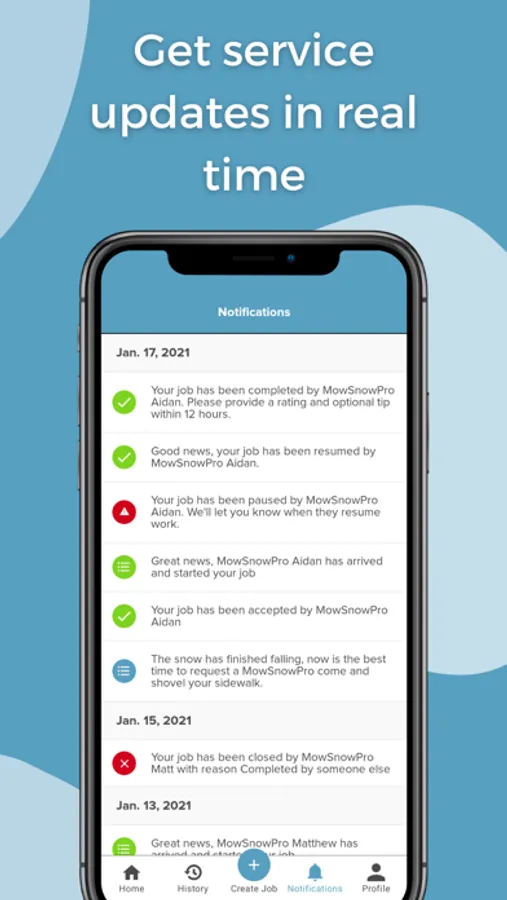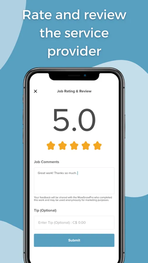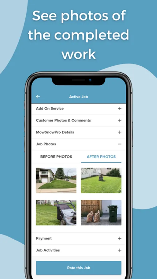 Get notified when your job is accepted. See before and after photos right from the app. Provide a rating, optional tip, and pay automatically.