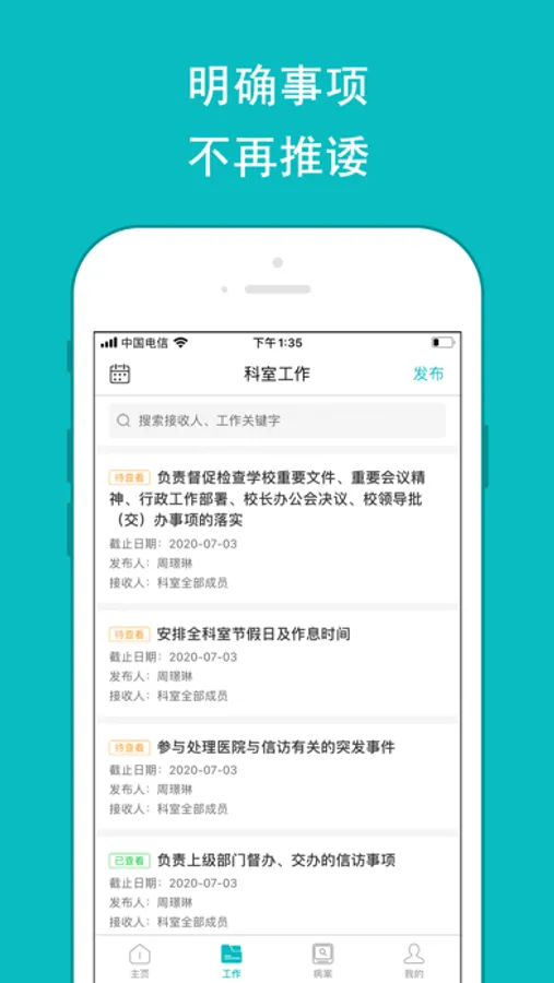 医省事包含科室成员、科室工作、病案、科室文件、天使排班、手术安排、线上培训七个模块,我们可以做到: