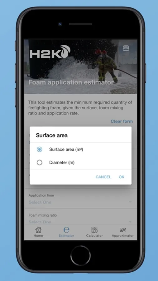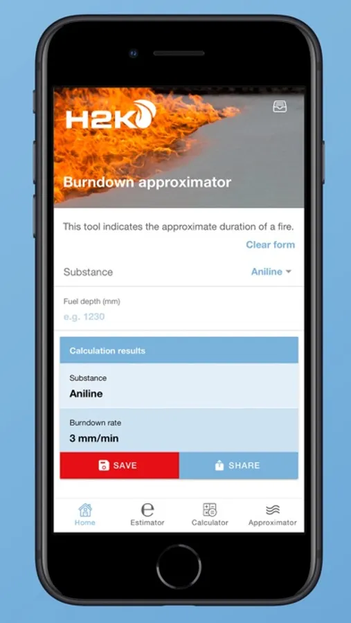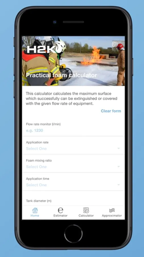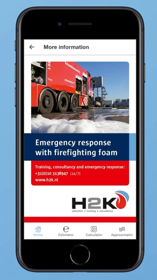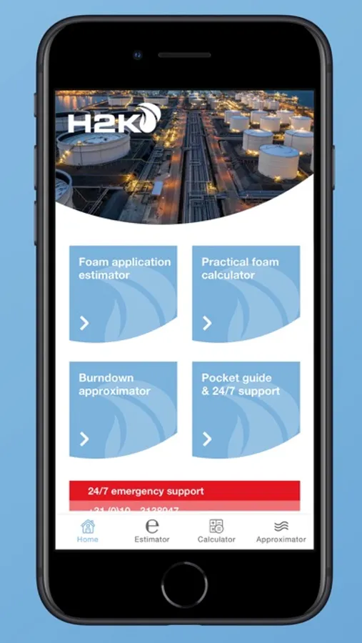 This mobile application supports emergency responders making their calculations. The tool contains e.g. a burn down estimator, flow and required amounts of water and foam concentrate. The results can be saved on your device and send directly to other people within your network. The app connects users directly to H2K 24/7 emergency response support.