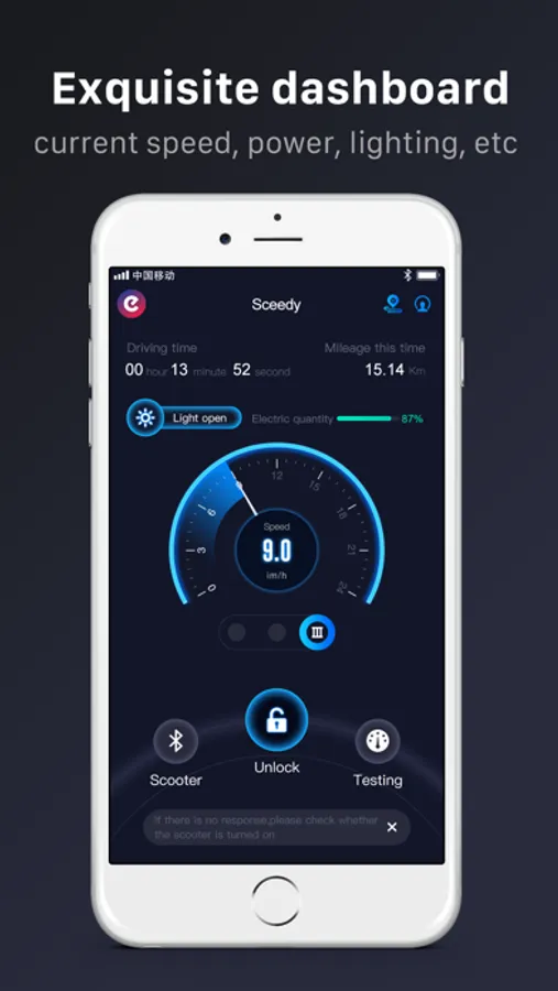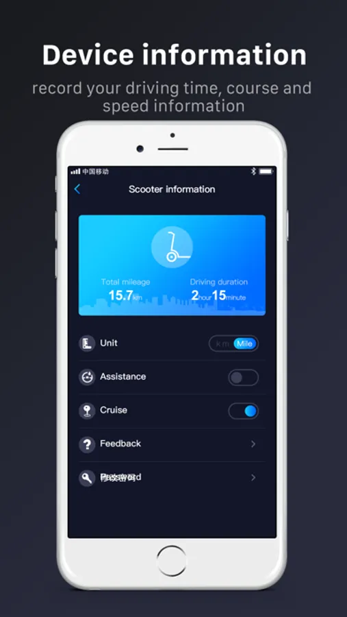 一款炫酷简洁的滑板车app,可以通过改应用查看当前骑行速度、电量、控制灯光并设置解锁密码;还可以检测滑板车故障情况,记录您的里程、平均速度等。