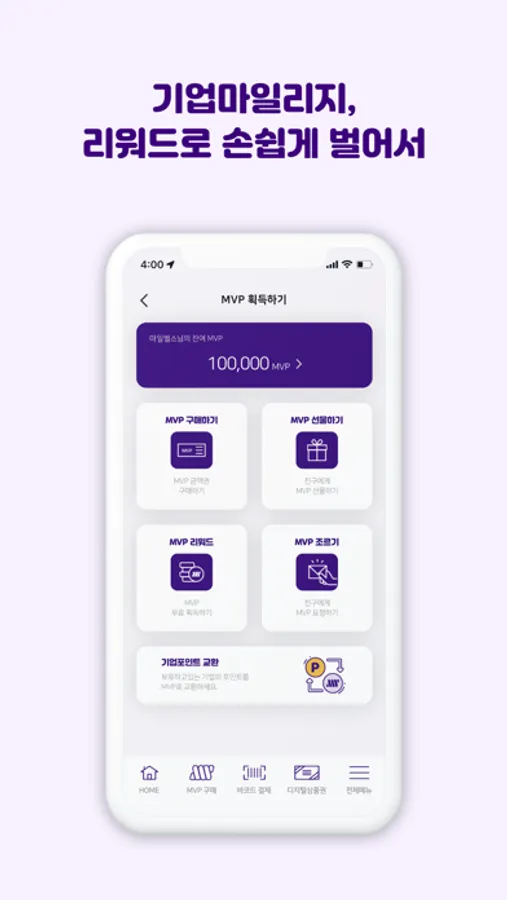 - 보유한 기업 마일리지를 MVP로 교환하여 사용합니다.
