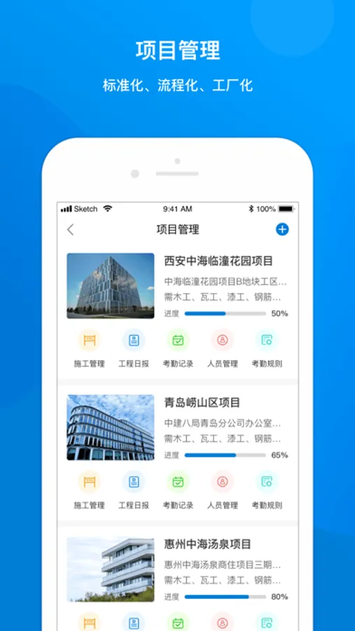 全新的项目管理流程,工作计划标准化,精准推送到每一位工人手中,工厂流程化施工,为建筑企业项目管理高效赋能,全面提高生产效率!