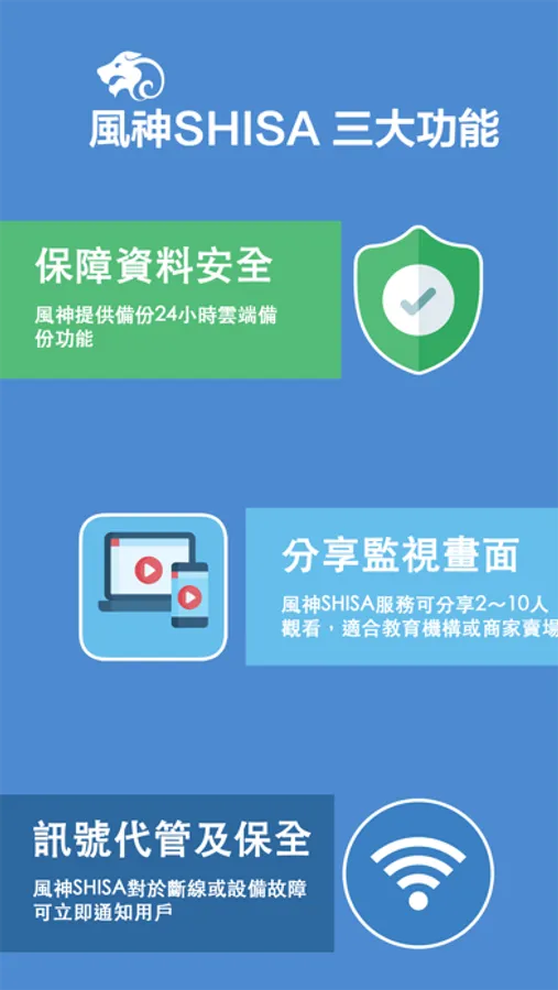 風神SHISA雲端服務在影像串流以及錄影資料方面 使用銀行等級的加密技術,確保您的隱私不會受到侵害。完全不需要擔心有人會在未取得您同意的情況下觀看您的風神SHISA的影像。