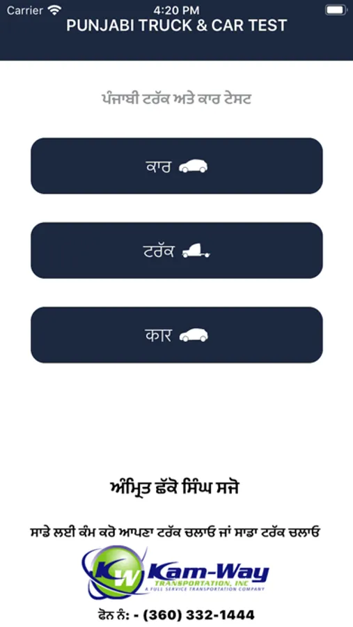 This app is for all Punjabi people taking the written car and truck exam. All tests are up to date and in Punjabi. Study these tests and pass! California and several other states in the United States are allowing the Truck written test to be in Punjabi. This app is completely free with no adds! This app is brought to you by Ustad Joe Tee Jatt and kamal. Please share with all Sikh Punjabi's and spread the help! Singh sajjo ta pass hovo!