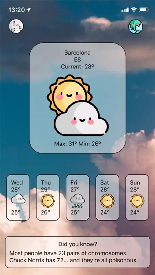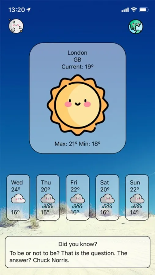 This weather app can show the weather at your current location plus forecast for 5 days. It allows to enter a city and see weather there as well. Plus it has some jokes!