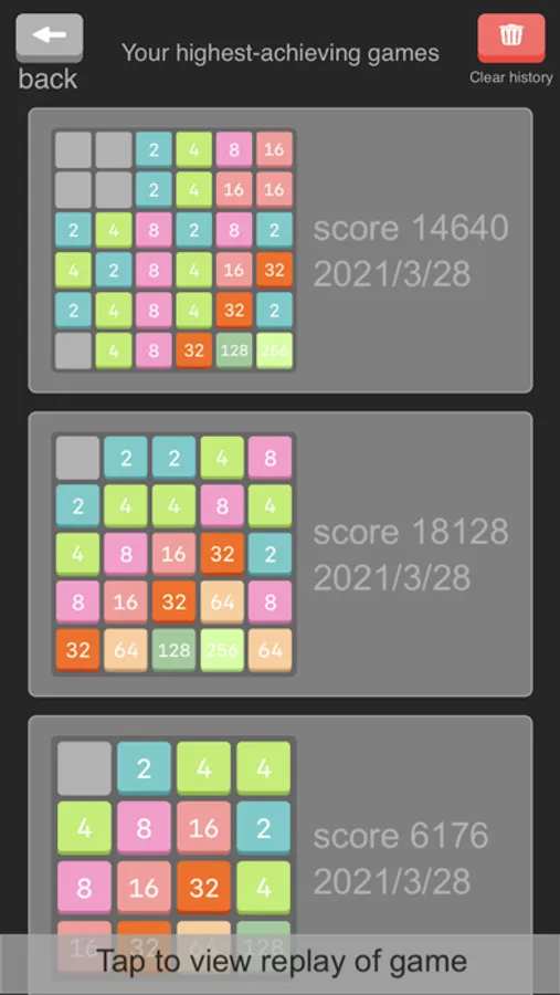 ⁃ The top 10 plays with highest score are saved and you can view game replaying later!