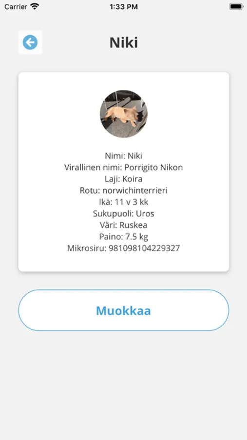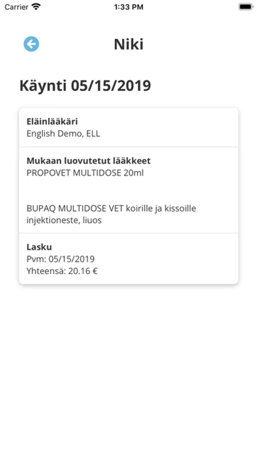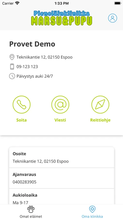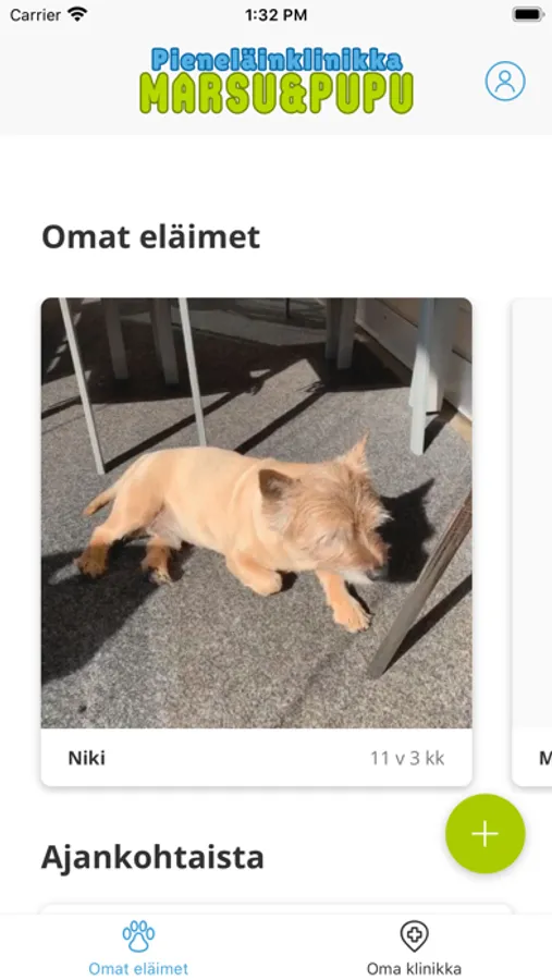 Mobiiliterveyskortti tarjoaa pieneläinklinikoiden asiakkaille mahdollisuuden katsella omien lemmikkien hoitotietoja sekä tehdä helposti ajanvarauksia klinikoille. Voit esimerkiksi tarkistaa helposti rokotusten ajantasaisuuden, jatkohoito-ohjeet sekä laboratoriotulokset. Sovelluksella voit myös tallentaa omia eläinten hoitomuistiinpanoja sekä tallentaa lemmikkisi kuvan eläimen terveyskorttiin. Kirjautuminen tapahtuu potilastietokantaamme ilmoittamallasi puhelinnumerolla, johon lähetetään tekstiviestinä salasana sovellukseen kirjautumiseen.