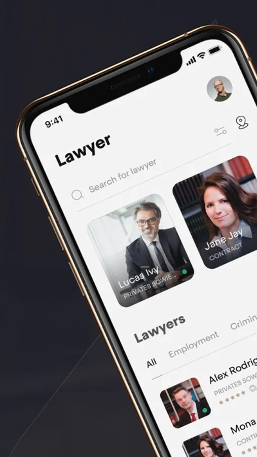 Find the right lawyer for your case, filtered by location, area of practice, rating and further criteria. The App will suggest matching lawyers and you can take your pick. Contact the lawyer directly through the chat or call function in the app. In case you are not happy with the suggestion, simply use the map or search function to see more relevant lawyers.