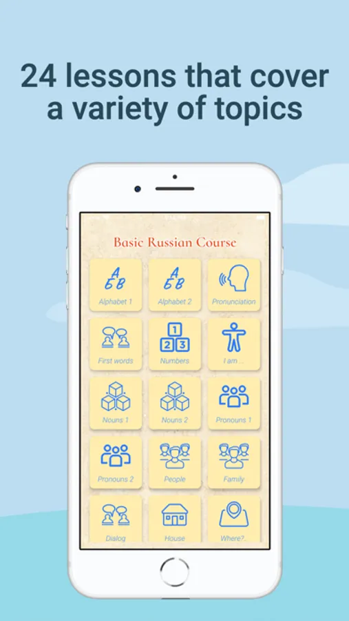 A basic course of Russian language. There are 24 lessons that cover many topics: from Russian alphabet to simple words and phrases to complicated grammar rules. The following parts of speech are covered: nouns, pronouns, verbs, adjectives, adverbs.