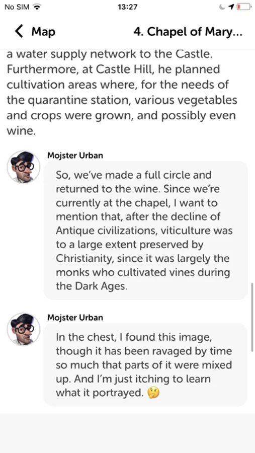 With the help of a virtual guide, navigate yourself through 7 stops on the beautiful and senic area of Castle hill - from a ruined fortress to a hidden vineyard. Learn about the history of the location and interesting facts about wine and vine.