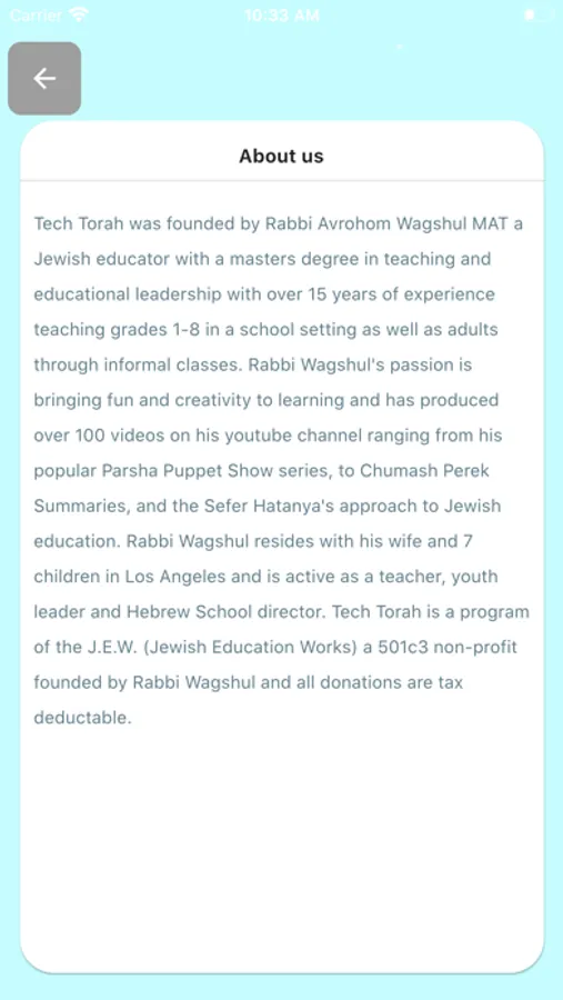Tech Torah was founded by Rabbi Avrohom Wagshul MAT a Jewish educator with a masters degree in teaching and educational leadership with over 15 years of experience teaching grades 1-8 in a school setting as well as adults through informal classes. Rabbi Wagshul's passion is bringing fun and creativity to learning and has produced over 100 videos on his youtube channel ranging from his popular Parsha Puppet Show series, to Chumash Perek Summaries, and the Sefer Hatanya's approach to Jewish education. Rabbi Wagshul resides with his wife and 7 children in Los Angeles and is active as a teacher, youth leader and Hebrew School director. Tech Torah is a program of the J.E.W. (Jewish Education Works) a 501c3 non-profit founded by Rabbi Wagshul and all donations are tax deductable.