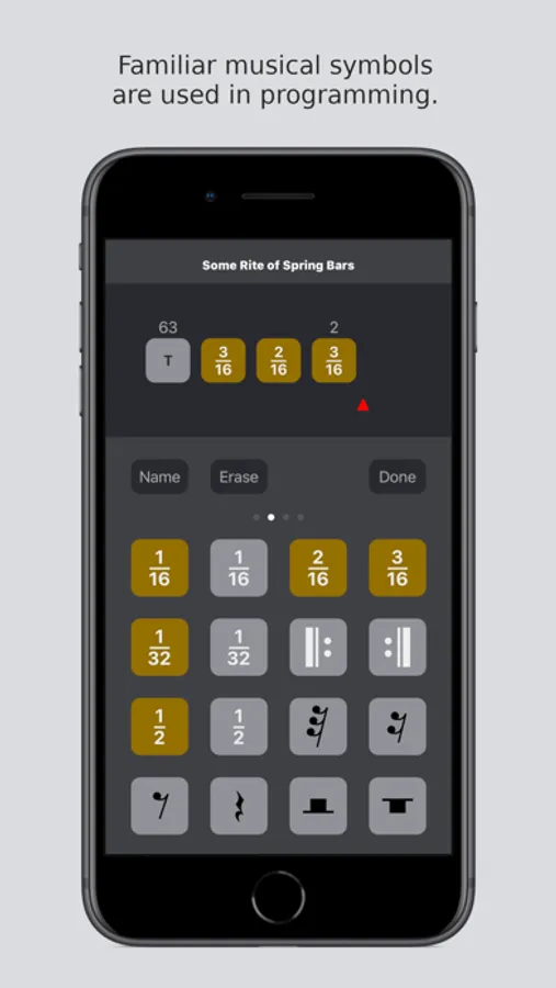 BARBARA the Metronome does not just tick. It plays bars. BARBARA has several pages of buttons with which you can make it play sequences of bars with notes like quarter notes, eight notes, sixteenth notes, and even thirty-second notes. You can specify how many times, or minutes, each bar is played.