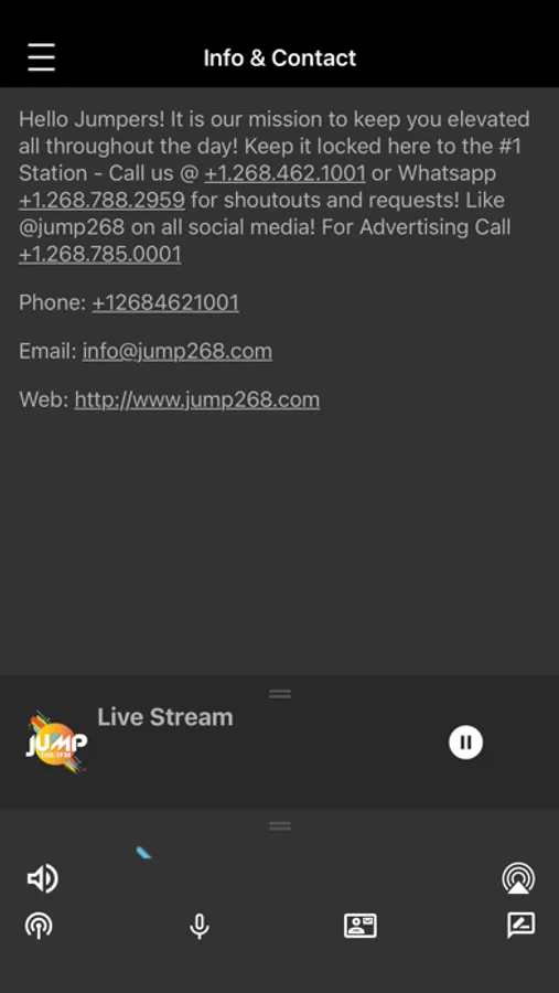 Jump is all about the elevation of entertainment! Log on to our online, on air and social media feeds for the best experience - day or night! Wake up & Shake up in the morning from 7am to 10am with Merchy, DJ Trema Shakes up your morning from 9am to 12midday. Log on to the Original ova-drive with Cav every afternoon from 3 to 6pm, Just Play with Riddim Master every Friday from 3 to 6pm! Check our full line up on www.jump268.com!