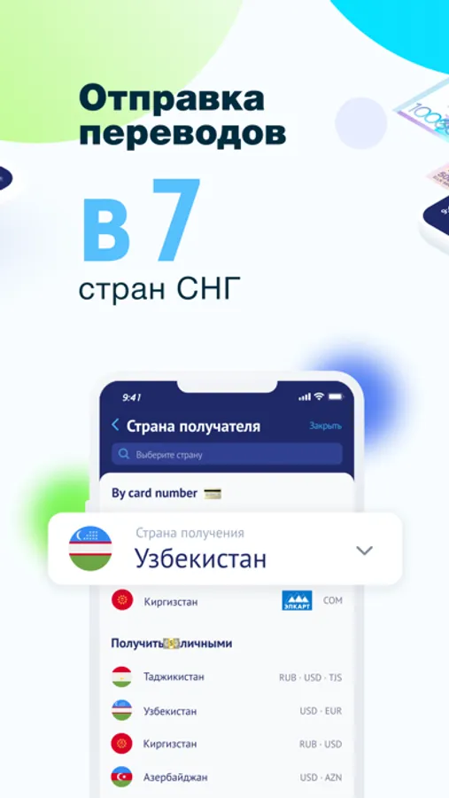 Using our App, you can transfer money from cards of any payment system to Uzbekistan, Tajikistan, Kazakhstan, Kyrgyzstan, Armenia, Moldova and Georgia.