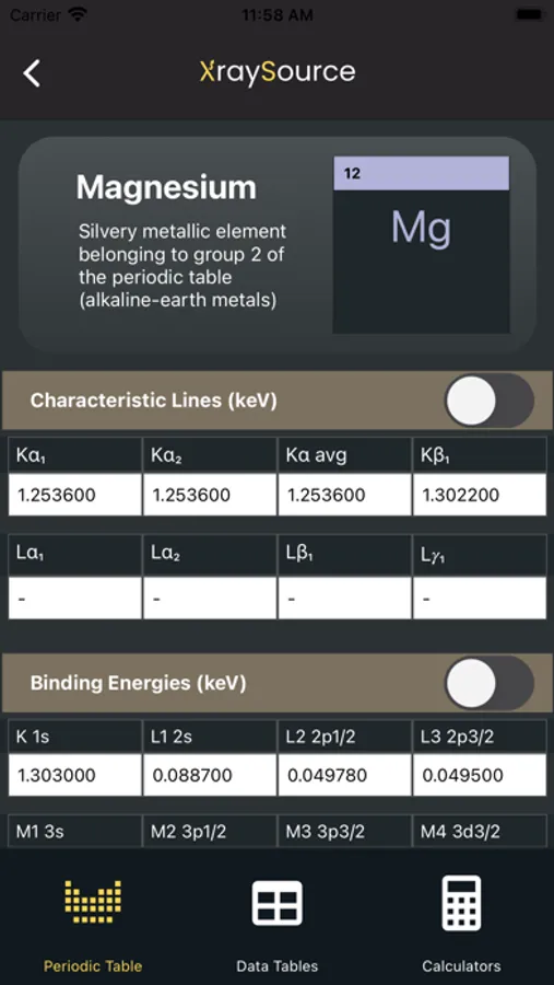 - A separate characteristic line lookup table, which allows the user to easily filter the entries by energy. Especially useful for XRF applications.