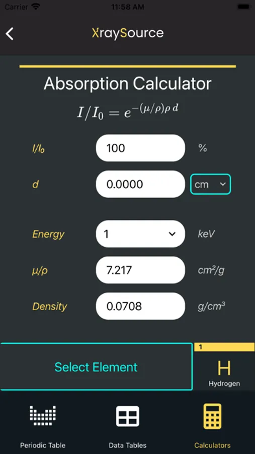 - An absorption calculator, which determines the amount of intensity attenuation to expect from a material with some known thickness or, conversely, how much material is needed to achieve a particular amount of attenuation. In addition, mass-attenuation coefficients can easily be imported from the relevant absorption tables.