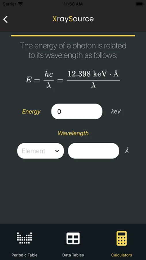 - An energy-wavelength converter, to easily convert photon wavelengths (both Angstroms and nanometers) into their corresponding energies and vice versa