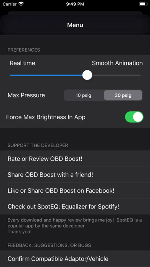 *Requires compatible bluetooth OBD-II adaptor (ELM327-based) and compatible 1996 or newer vehicle. This app reads the MAP (Manifold Air Pressure) value from OBD-II to determine you current level of boost or vacuum. This gauge is not intended to give professionally-accurate readings; it is designed primarily for entertainment purposes.