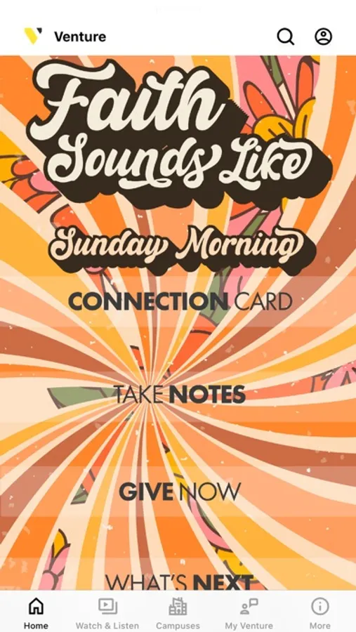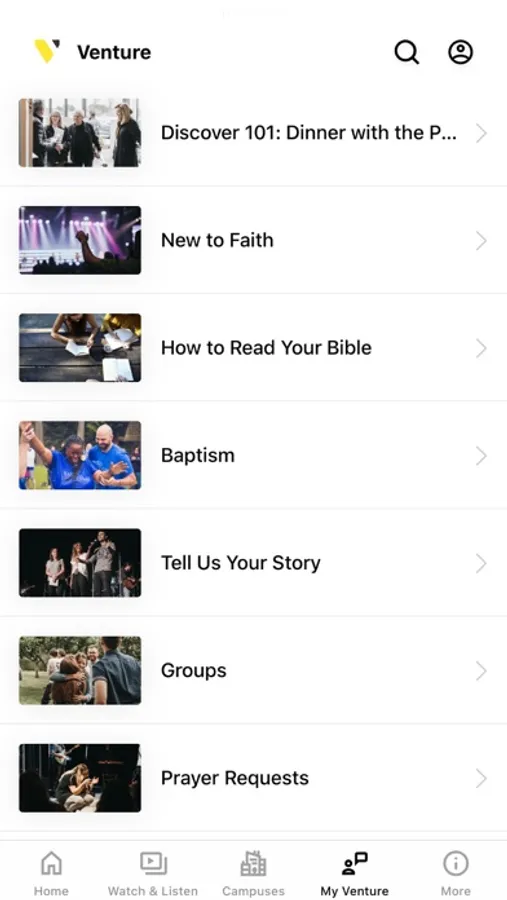 The Venture Church app provides info about events, services, locations and ministries. Use the app to get connected, sign up for small groups, interact with weekend services (program, connection card, information requests and note taking), for Bible reading and to access messages and media.
